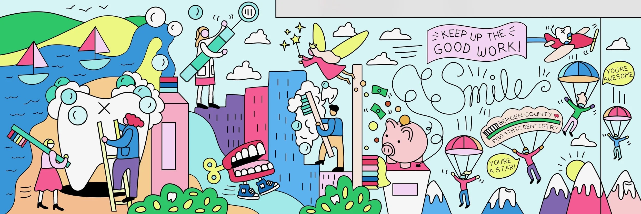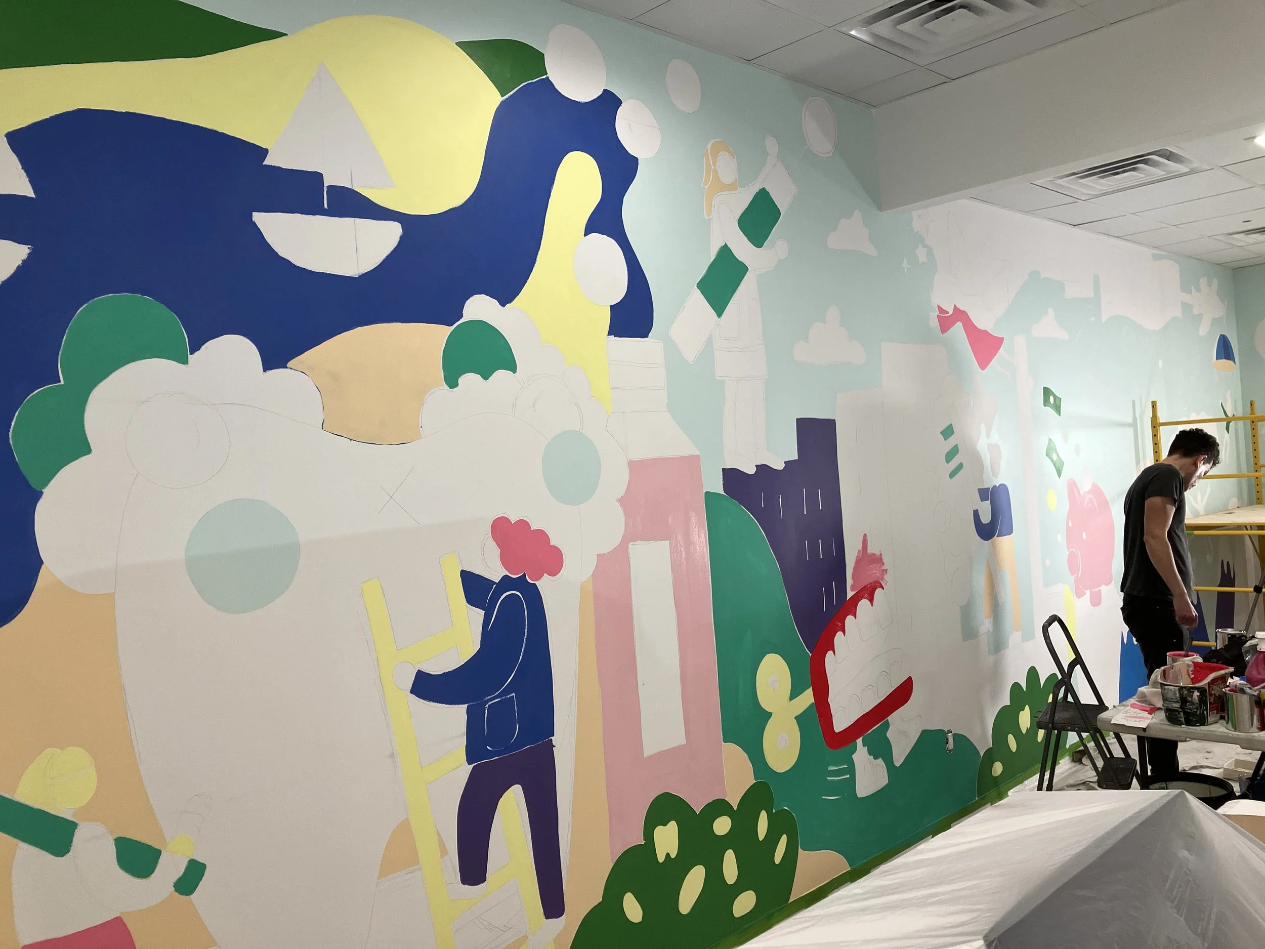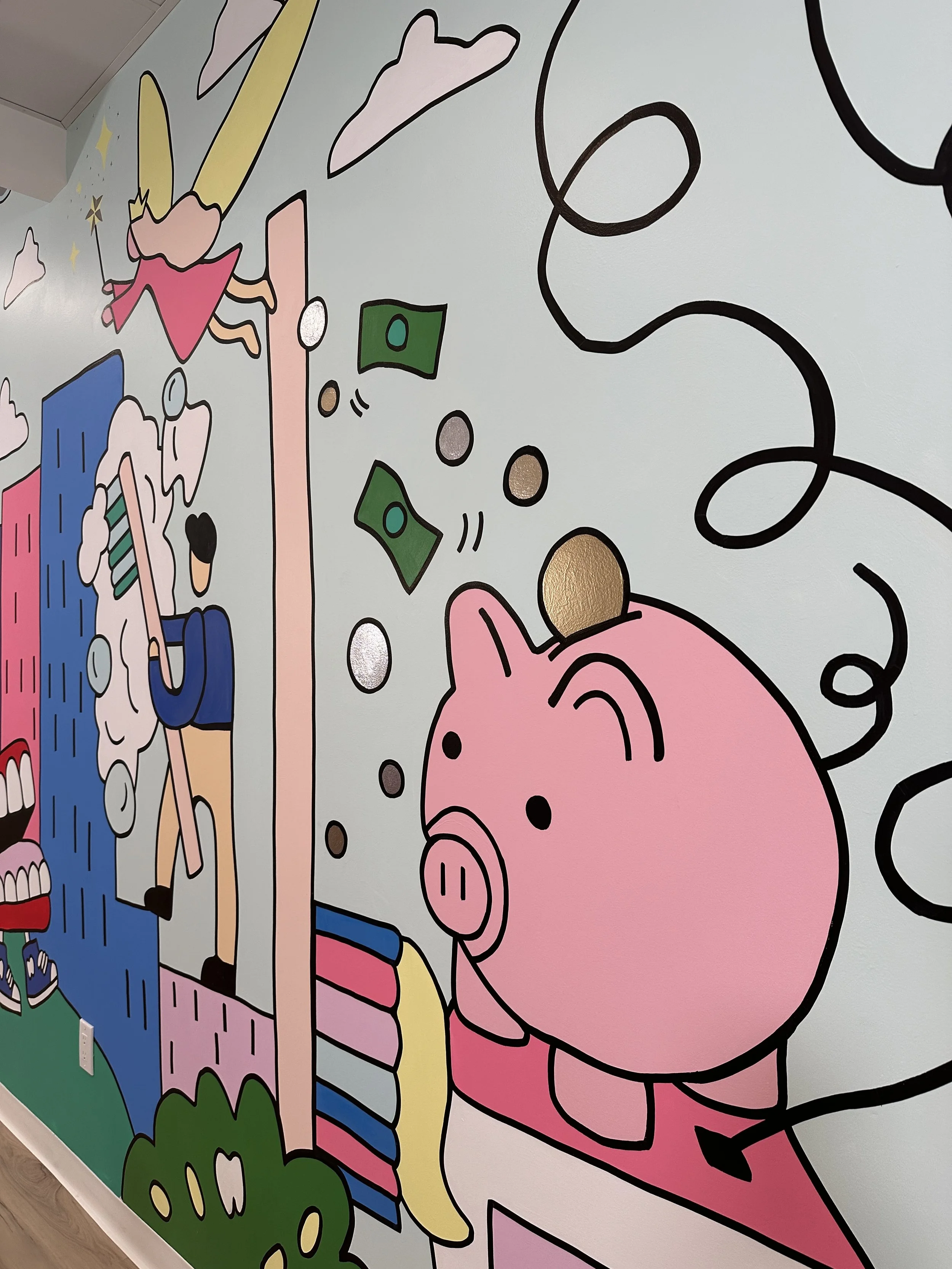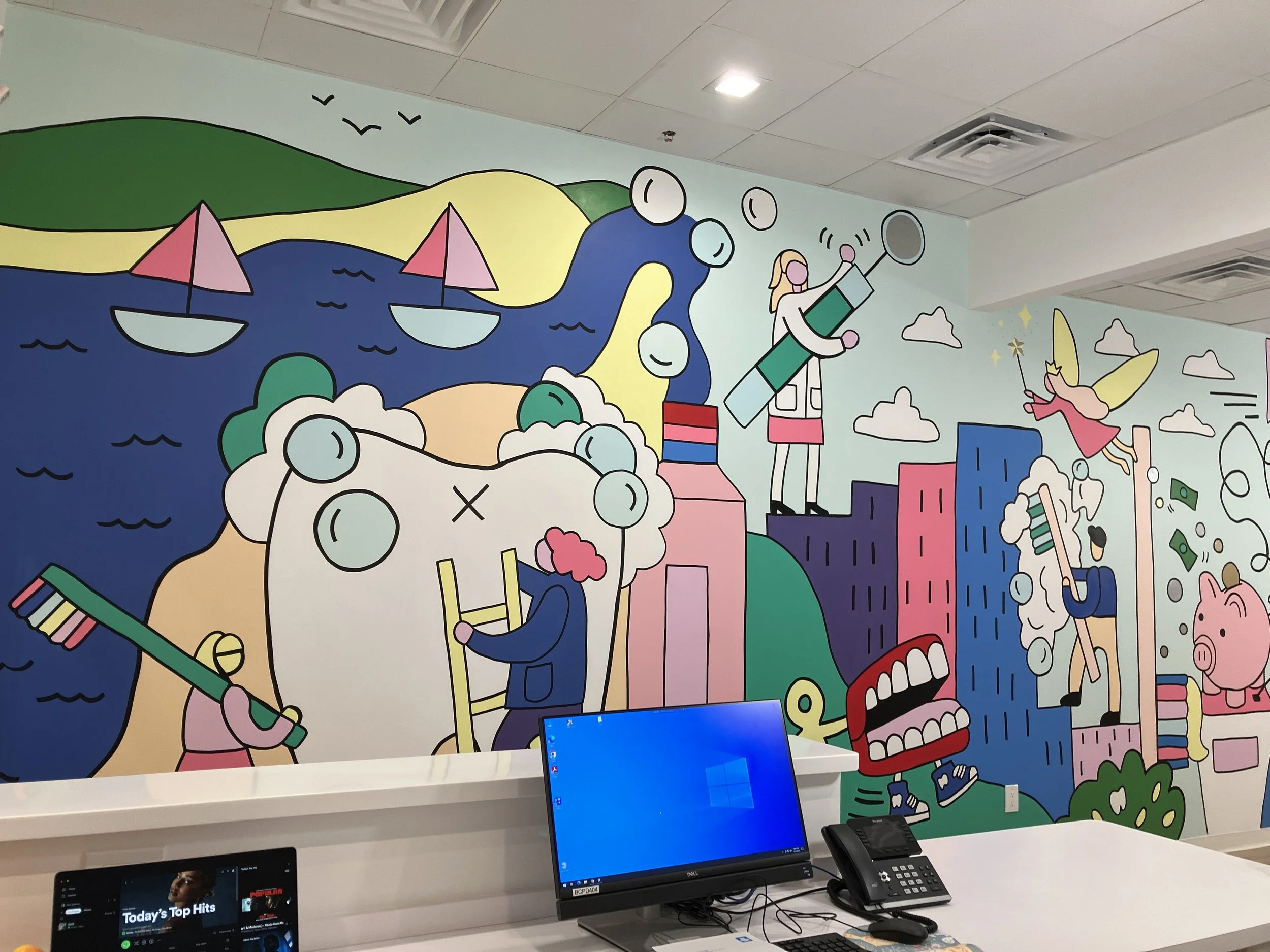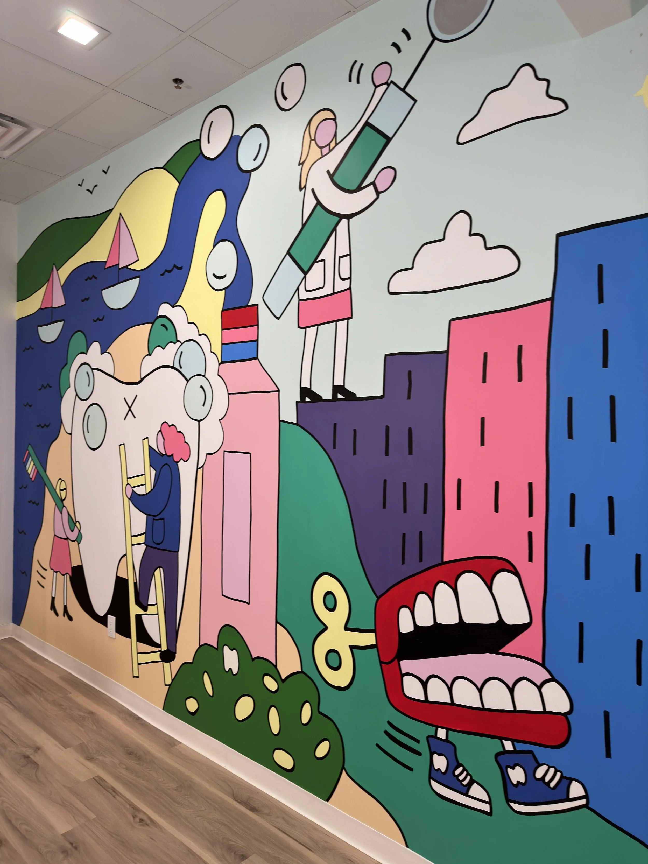 The goals of this mural design was to be appropriate for a wide range of ages and to incorporate a photo op area in the mural for patients to take pictures after their appointments. Rebecca incorporated an ‘I spy’ theme to the mural, hiding dentist imagery into a city scape scene to make it fun for anyone to discover something new each time they look at it.