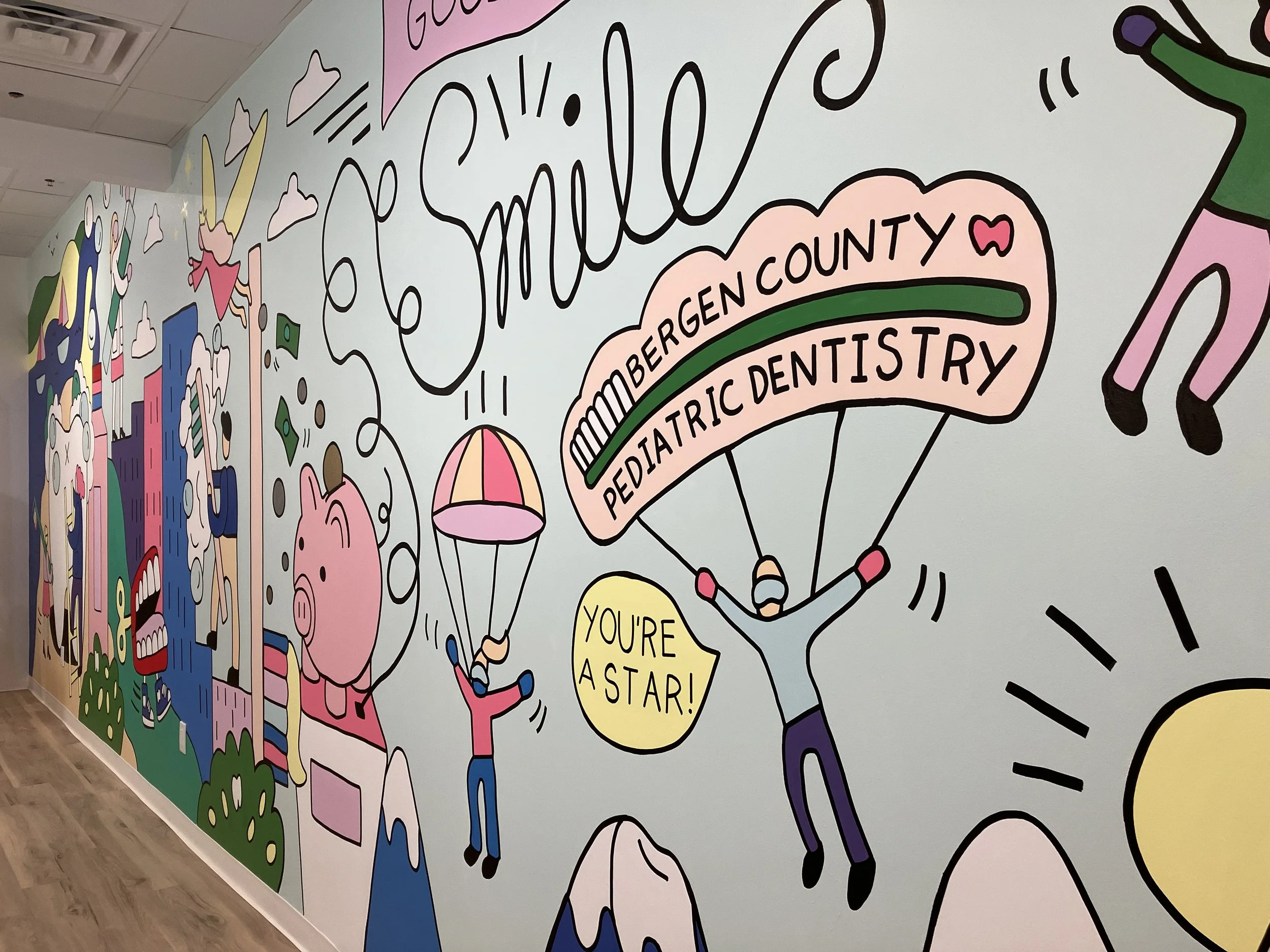 Project Details: Rebecca was hired by Bergen County Pediatric Dentistry to create an interior hand-painted mural for their NJ office. Rebecca worked with fellow muralist, Marshall Okin of Art Etc, to complete and produce this project.