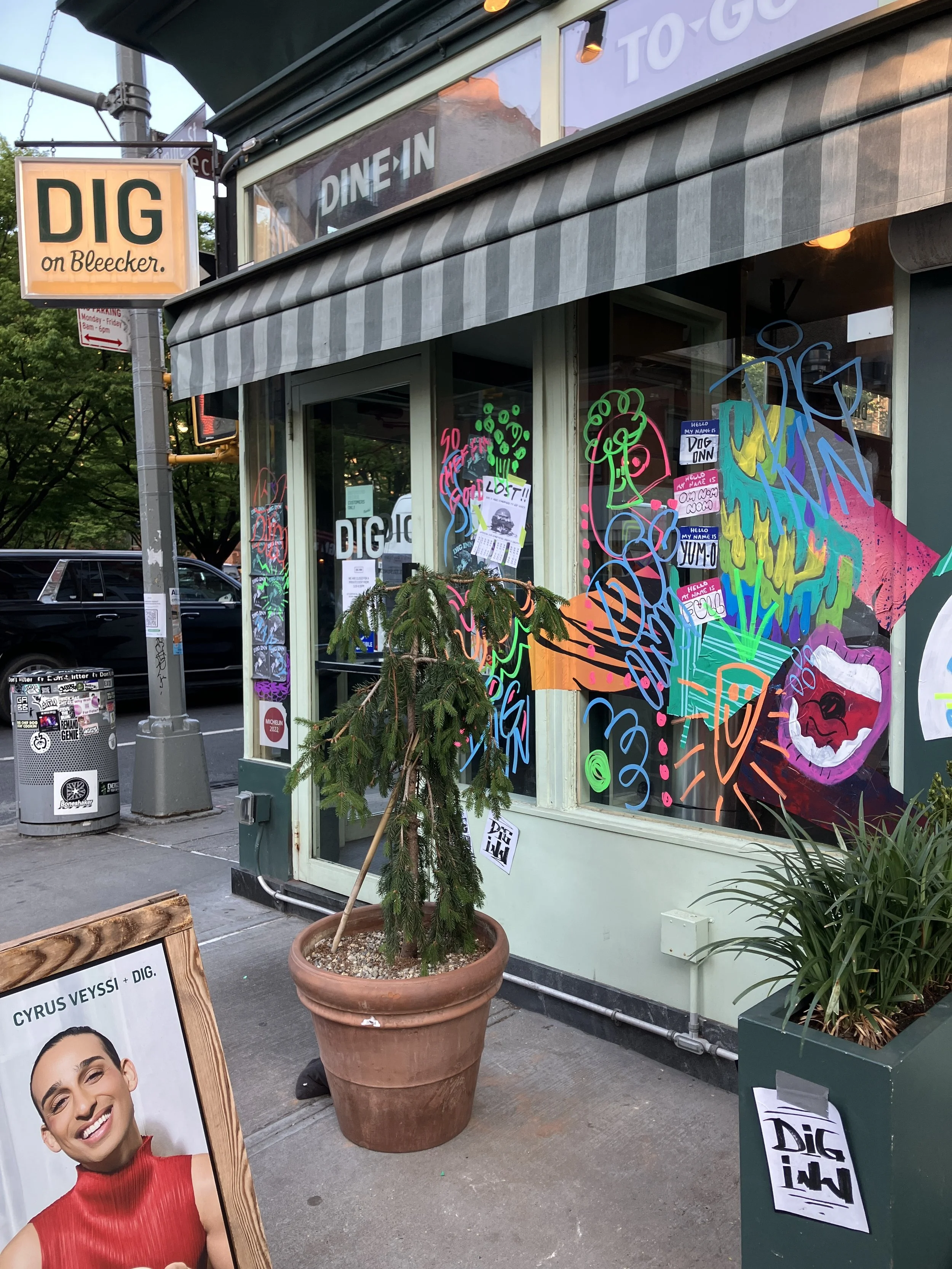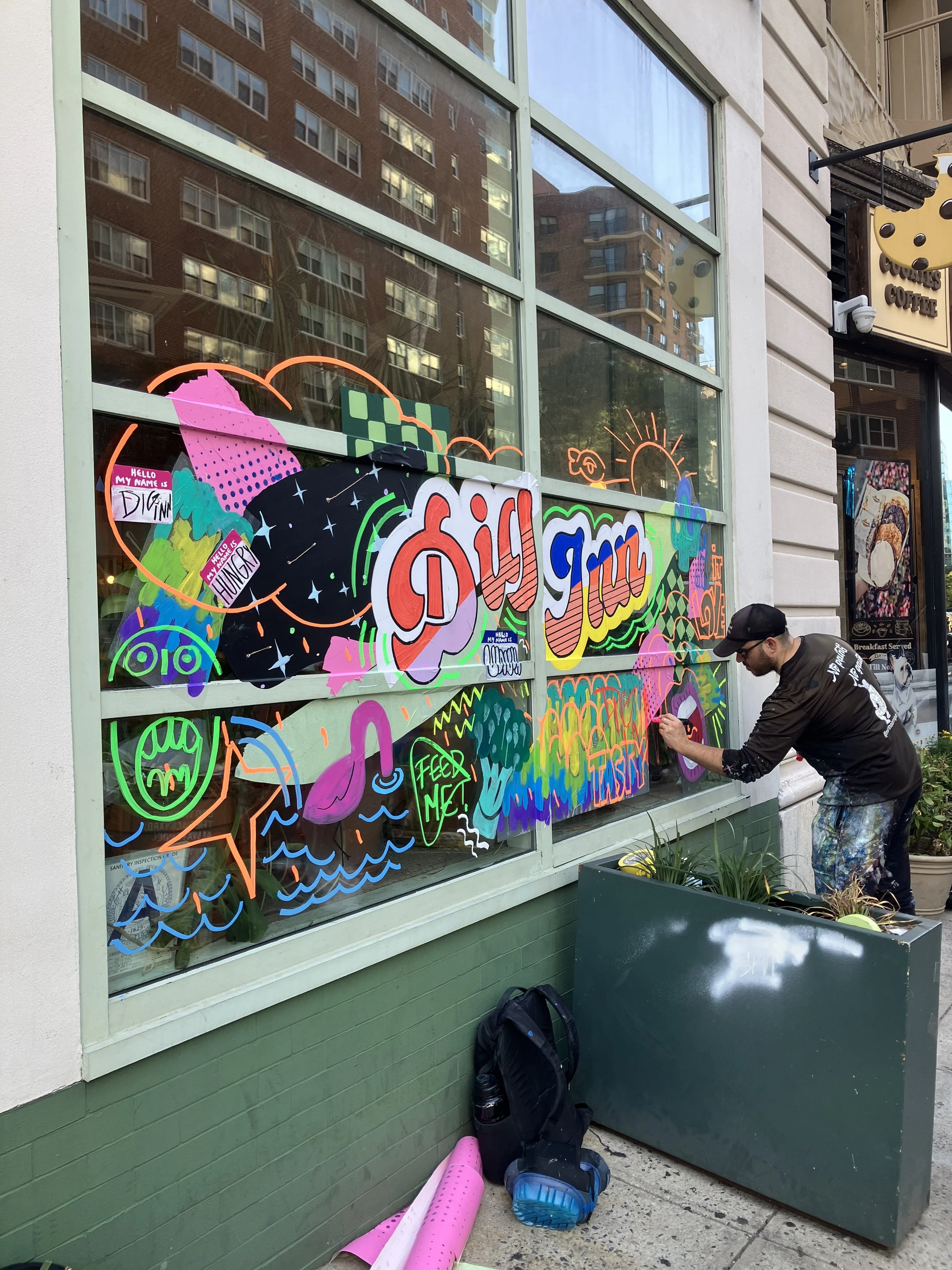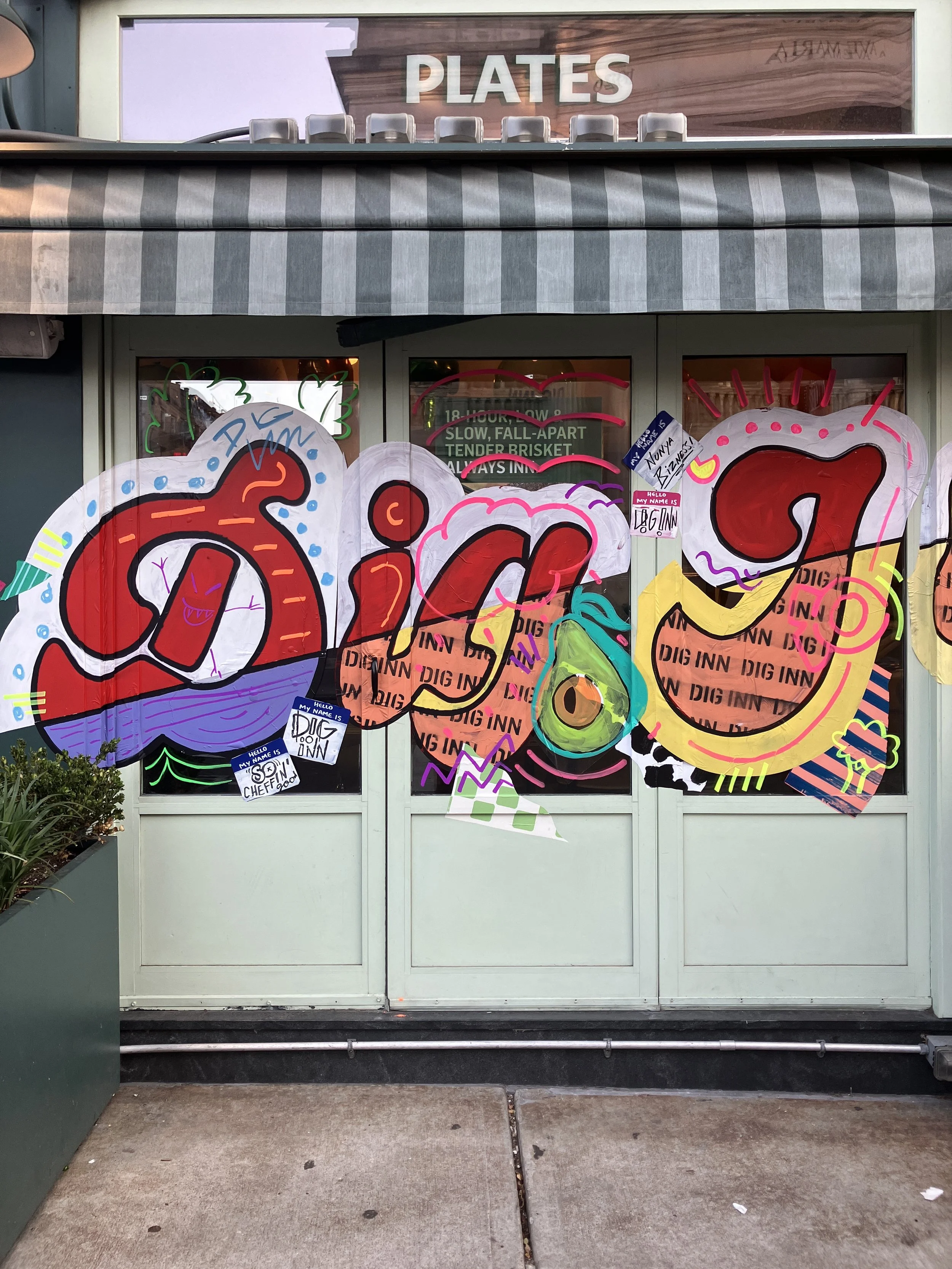 Dig Inn was holding a marketing event to celebrate the rebranding of the chain. They wanted a graffiti style art installation at 12 different locations around NYC that incorporated Dig Inn’s logo and menu items within an energetic design. Marshall and Rebecca figured out the best way to execute this design across the city by working with a larger team and creating a system that allowed for a swift and exciting installation for passerby’s to experience.