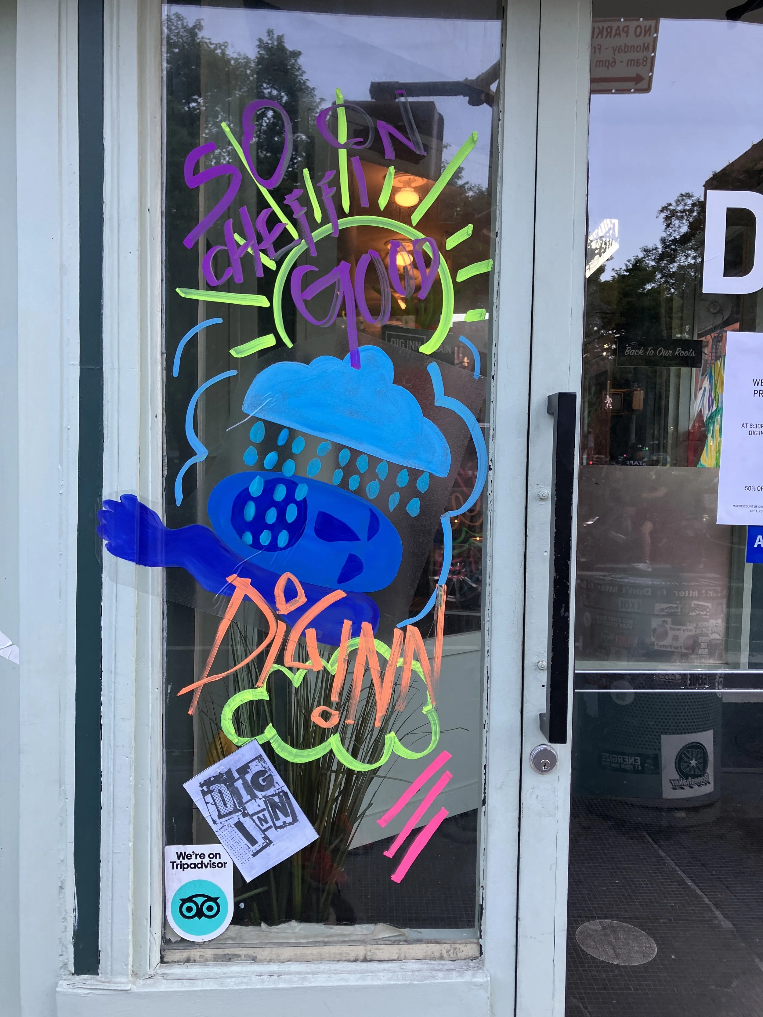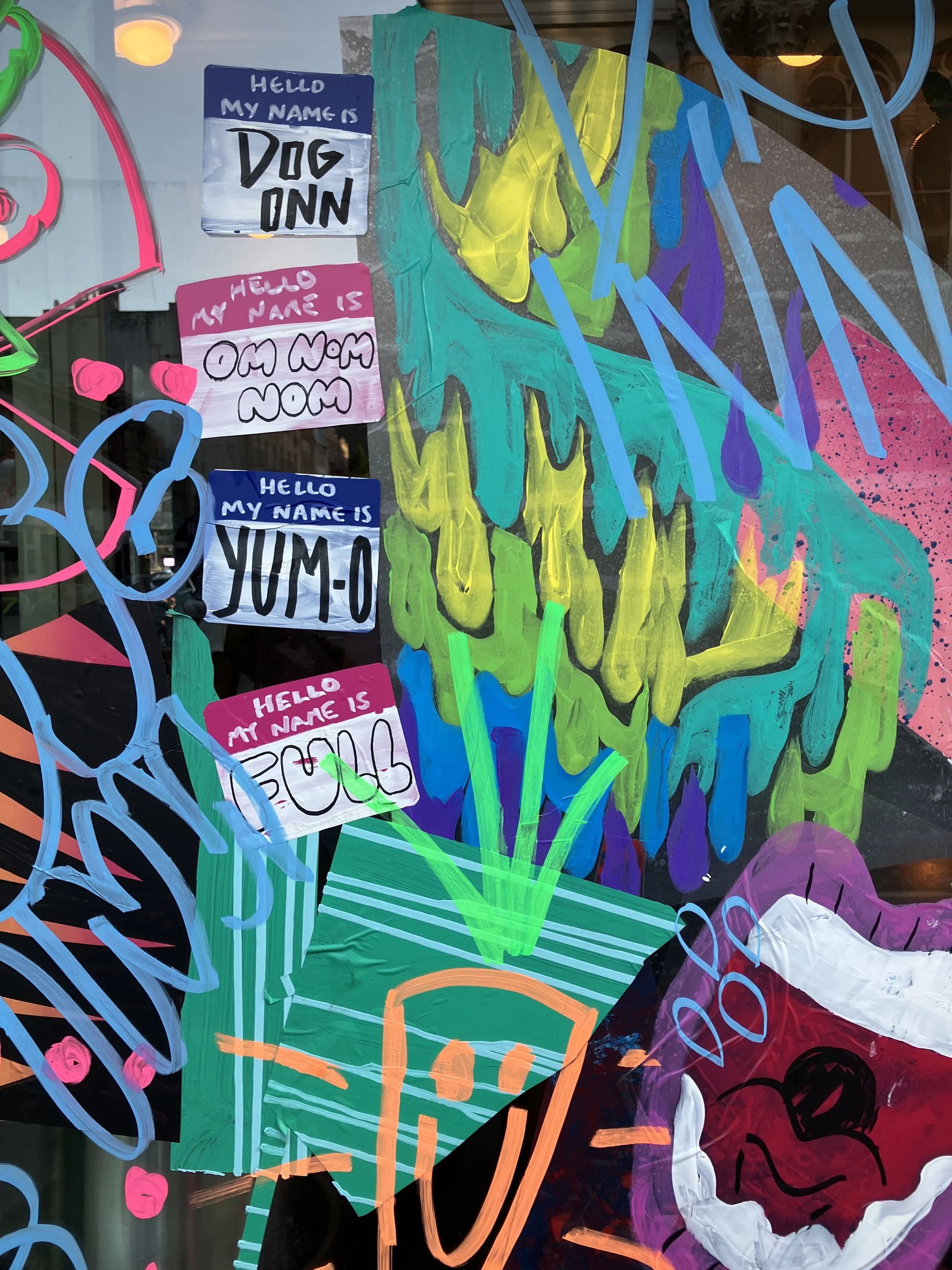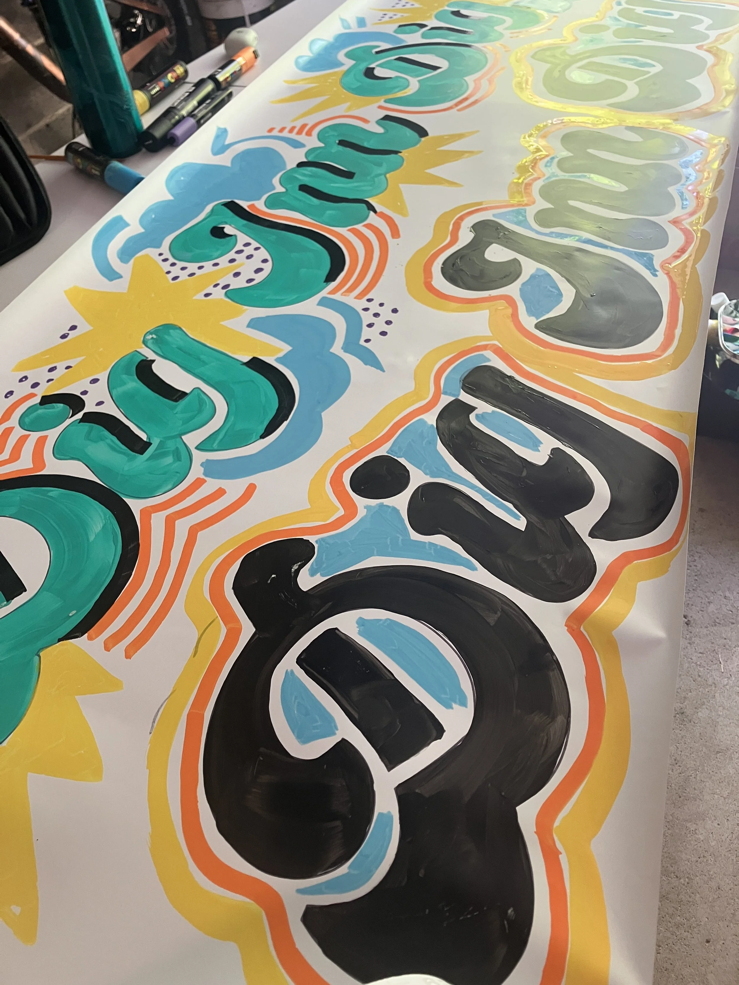 Dig Inn was holding a marketing event to celebrate the rebranding of the chain. They wanted a graffiti style art installation at 12 different locations around NYC that incorporated Dig Inn’s logo and menu items within an energetic design. Marshall and Rebecca figured out the best way to execute this design across the city by working with a larger team and creating a system that allowed for a swift and exciting installation for passerby’s to experience.