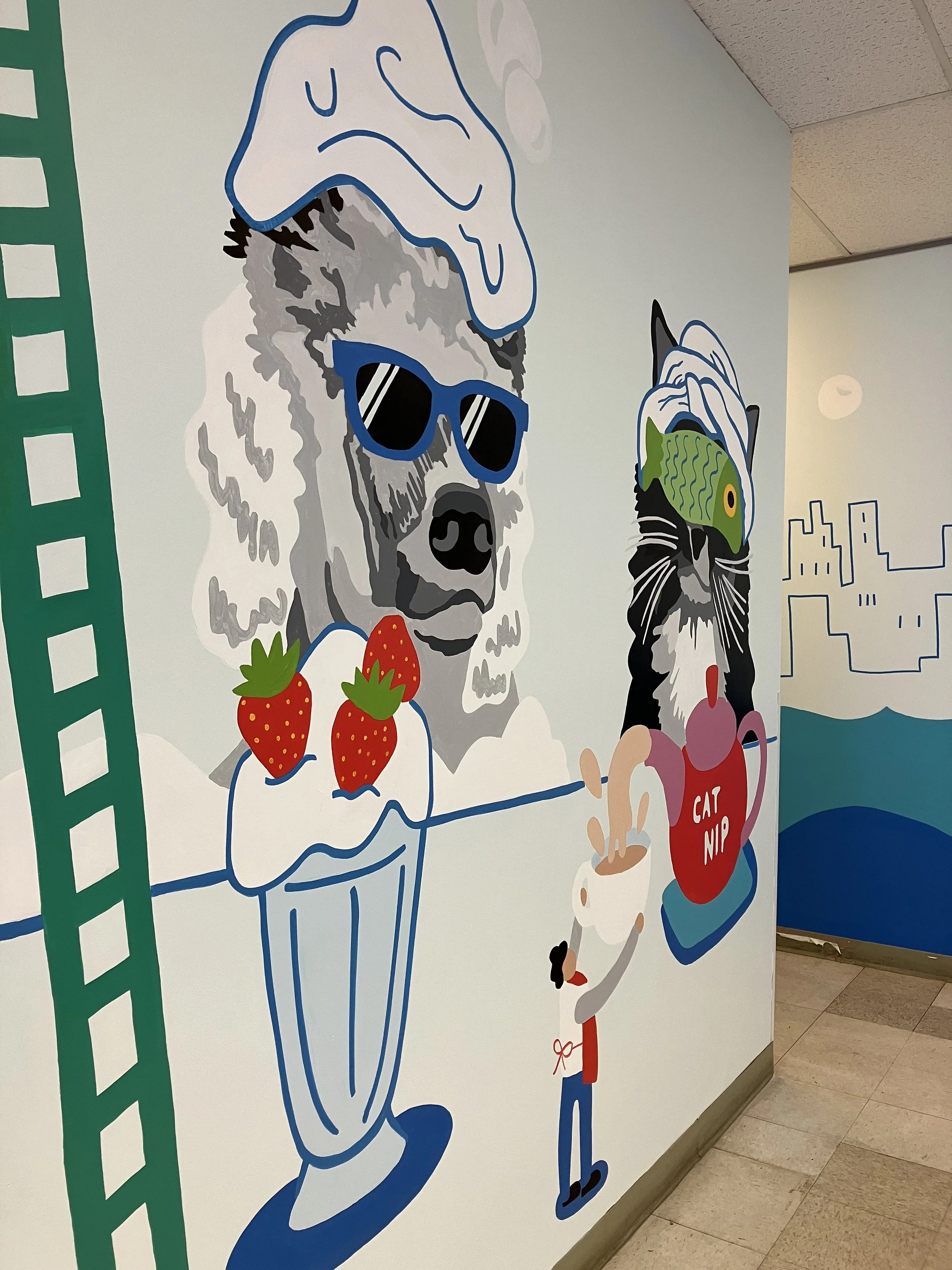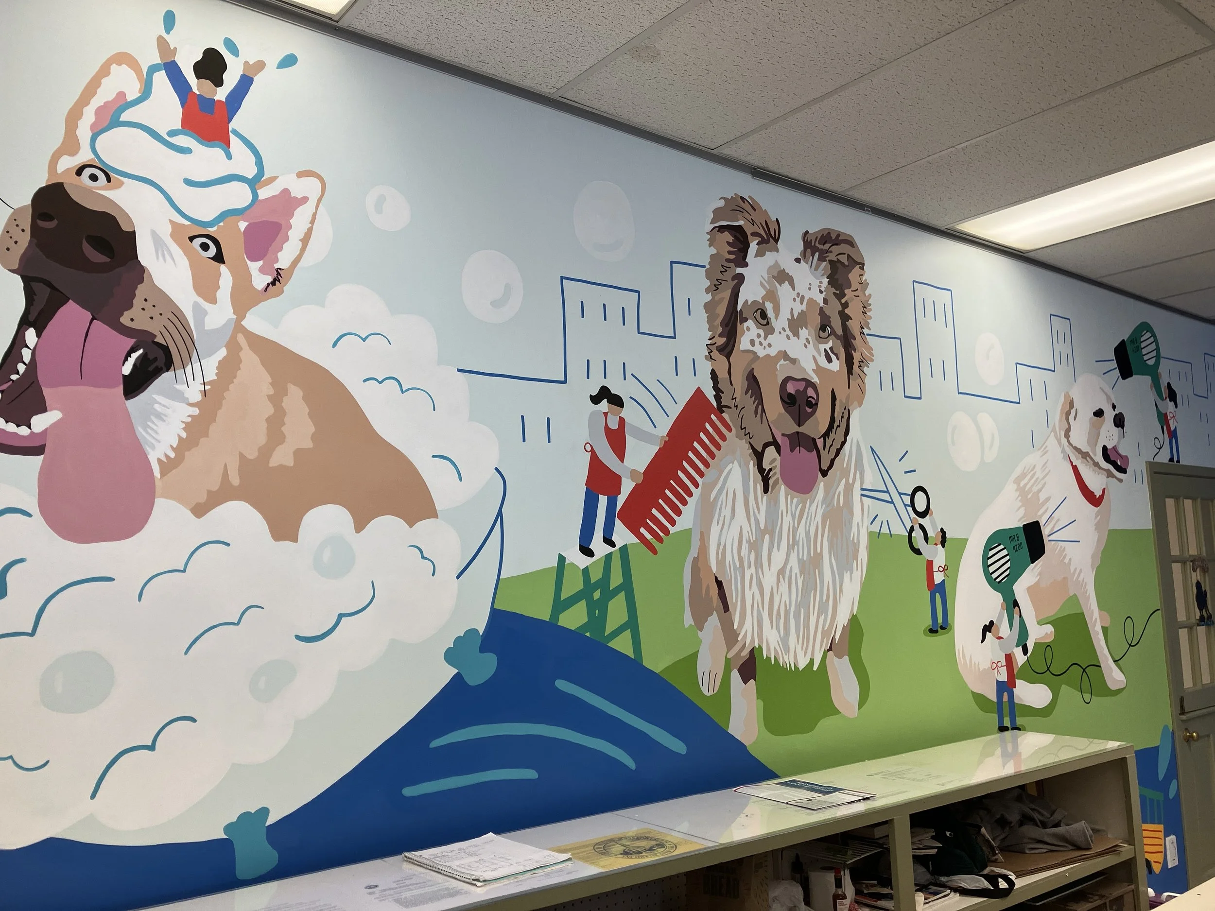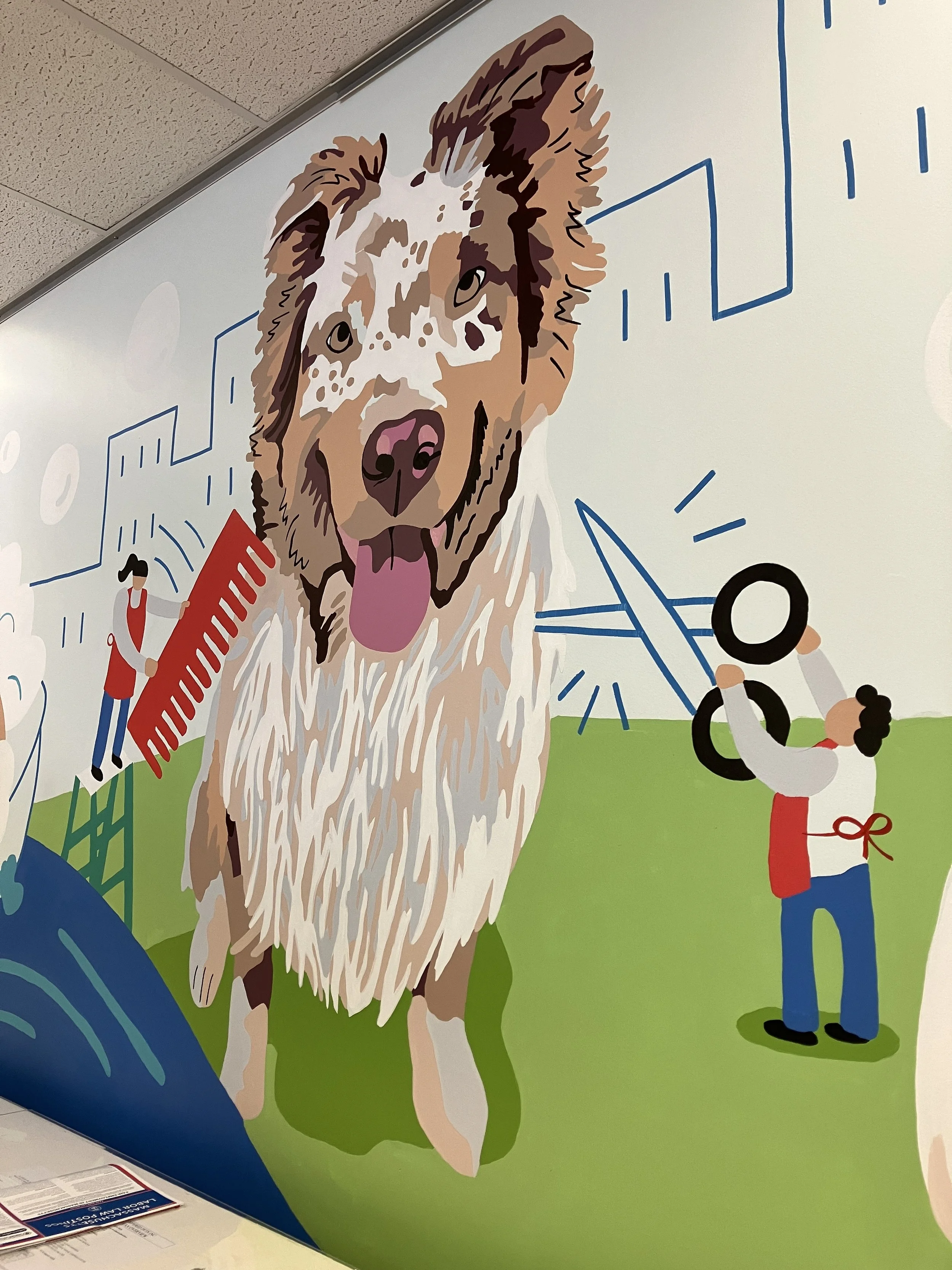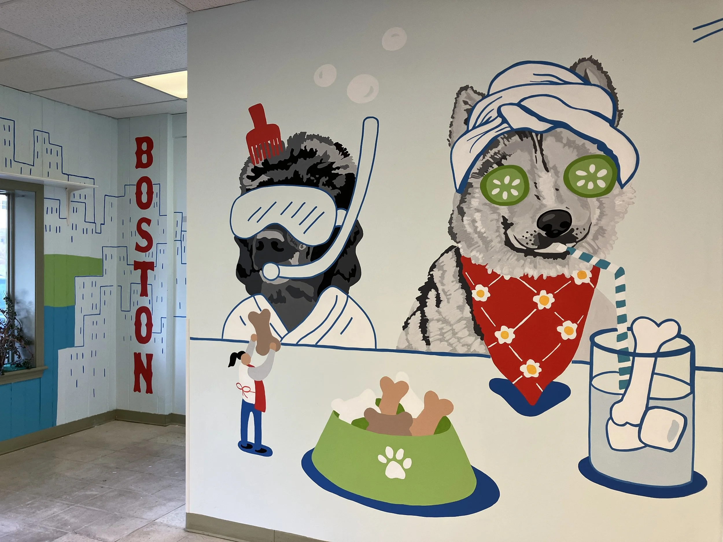 The design for this large-scale interior mural covered all the walls when you enter the dog grooming spot. The client wanted to incorporate pet portraits of his own pets as well as the pets of the employees. We incorporated recognizable landmarks of the Boston area into this design as well as a photo-op area for the newly groomed pets to pose in front of. Some much humor and fun!