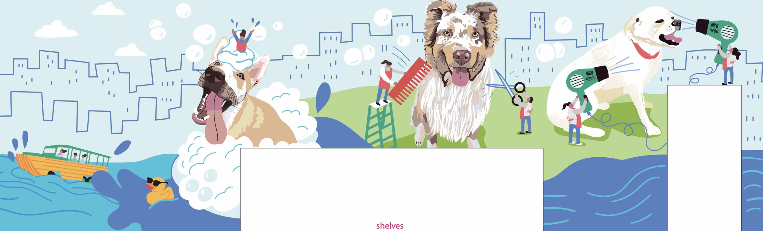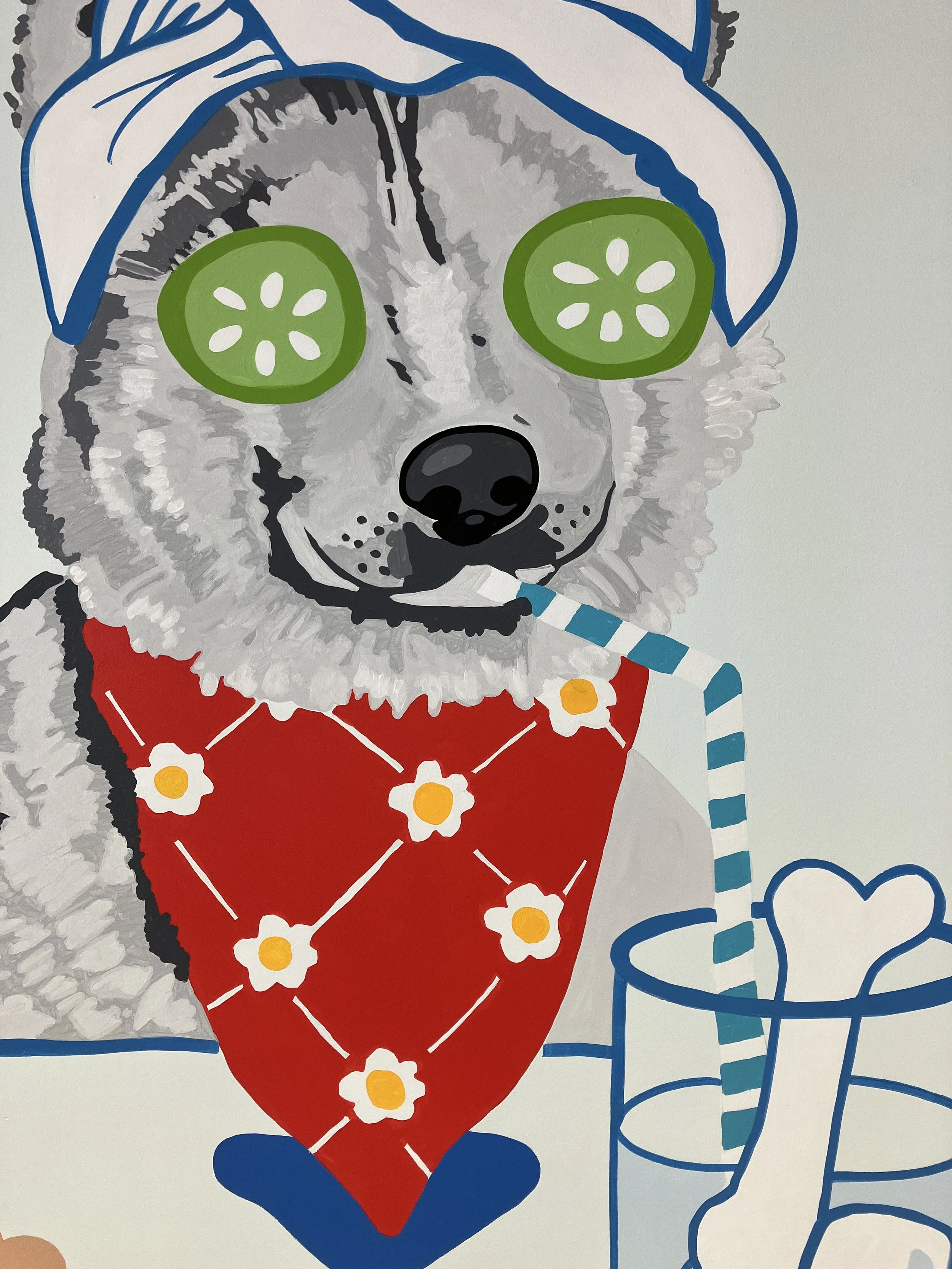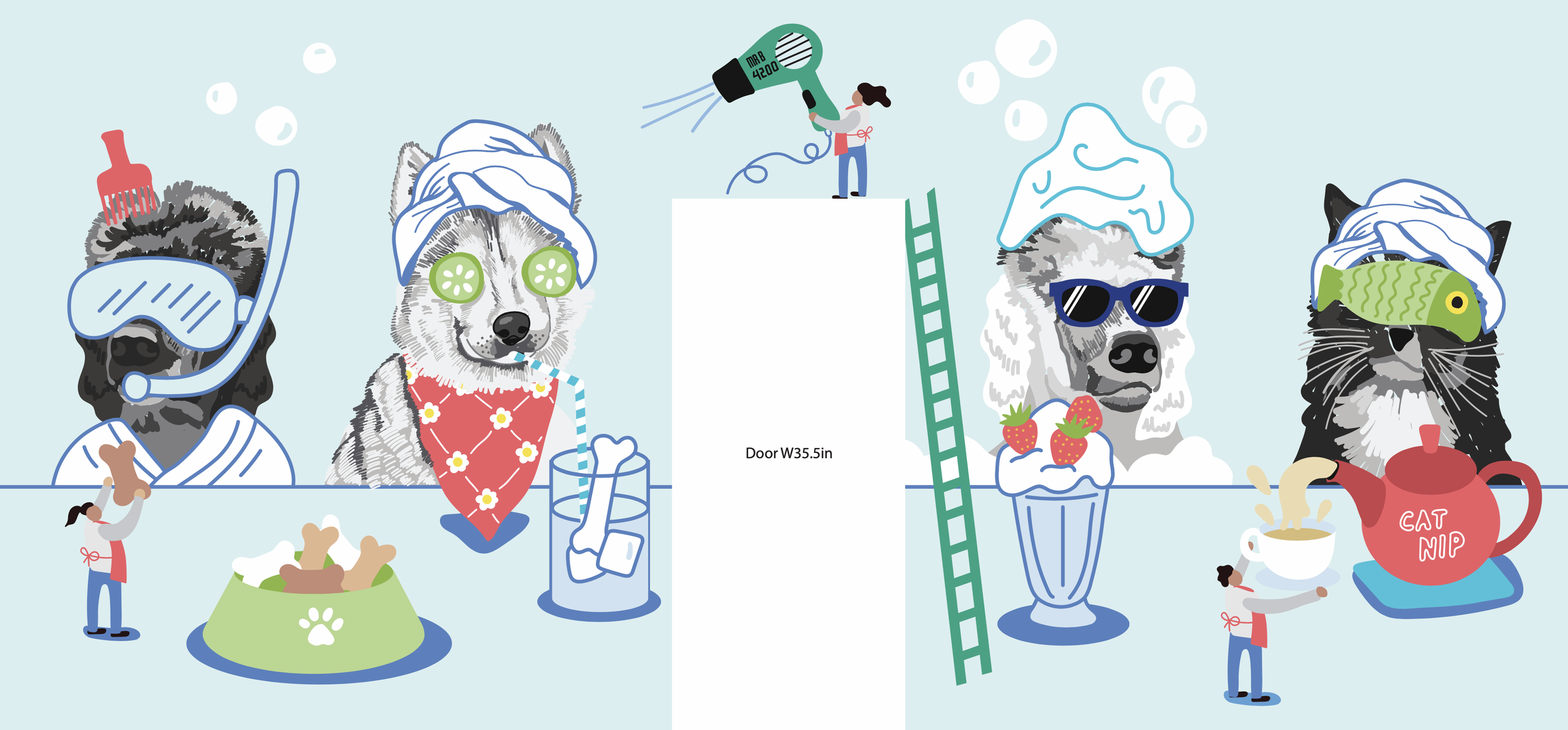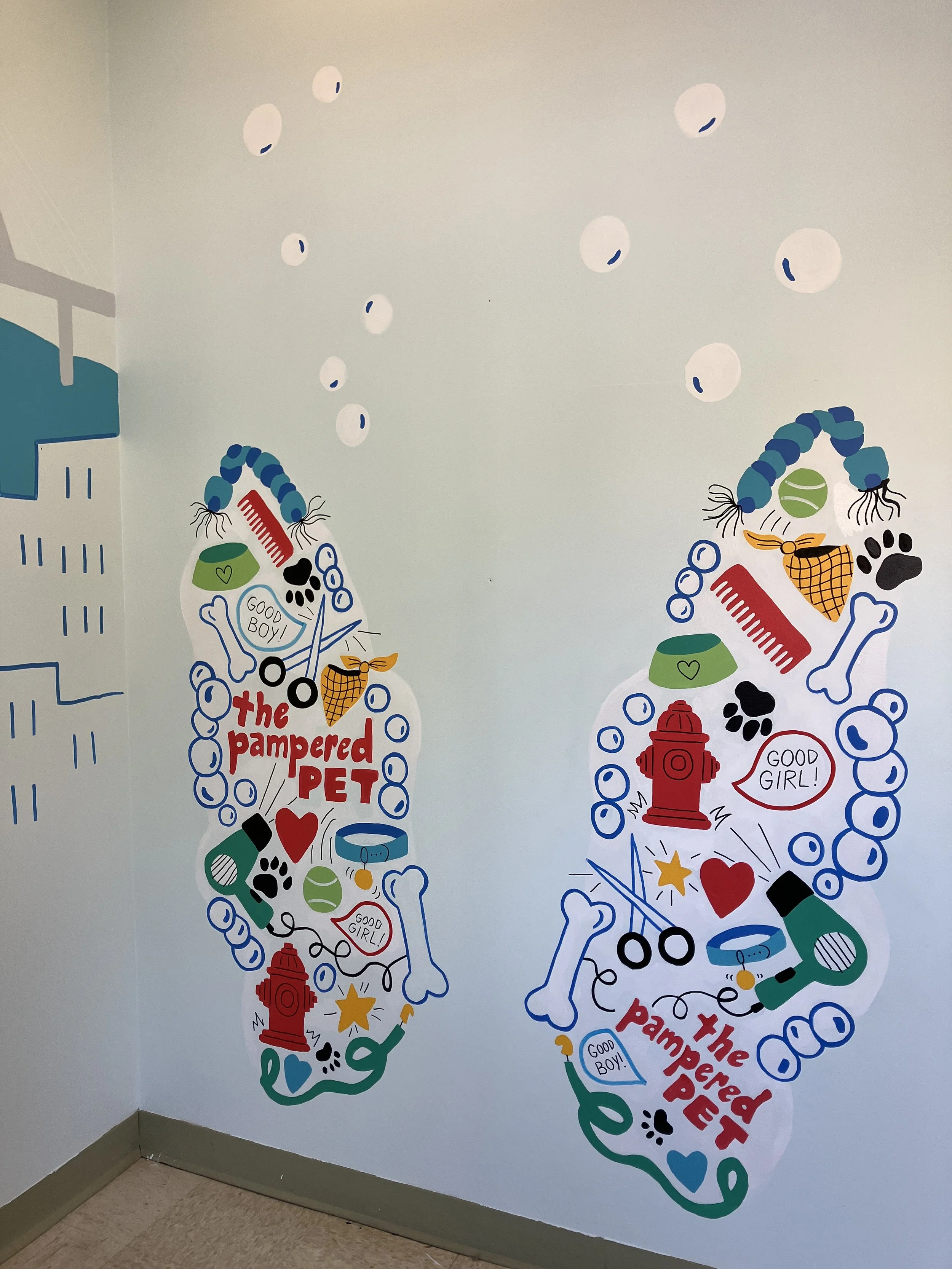 The design for this large-scale interior mural covered all the walls when you enter the dog grooming spot. The client wanted to incorporate pet portraits of his own pets as well as the pets of the employees. We incorporated recognizable landmarks of the Boston area into this design as well as a photo-op area for the newly groomed pets to pose in front of. Some much humor and fun!