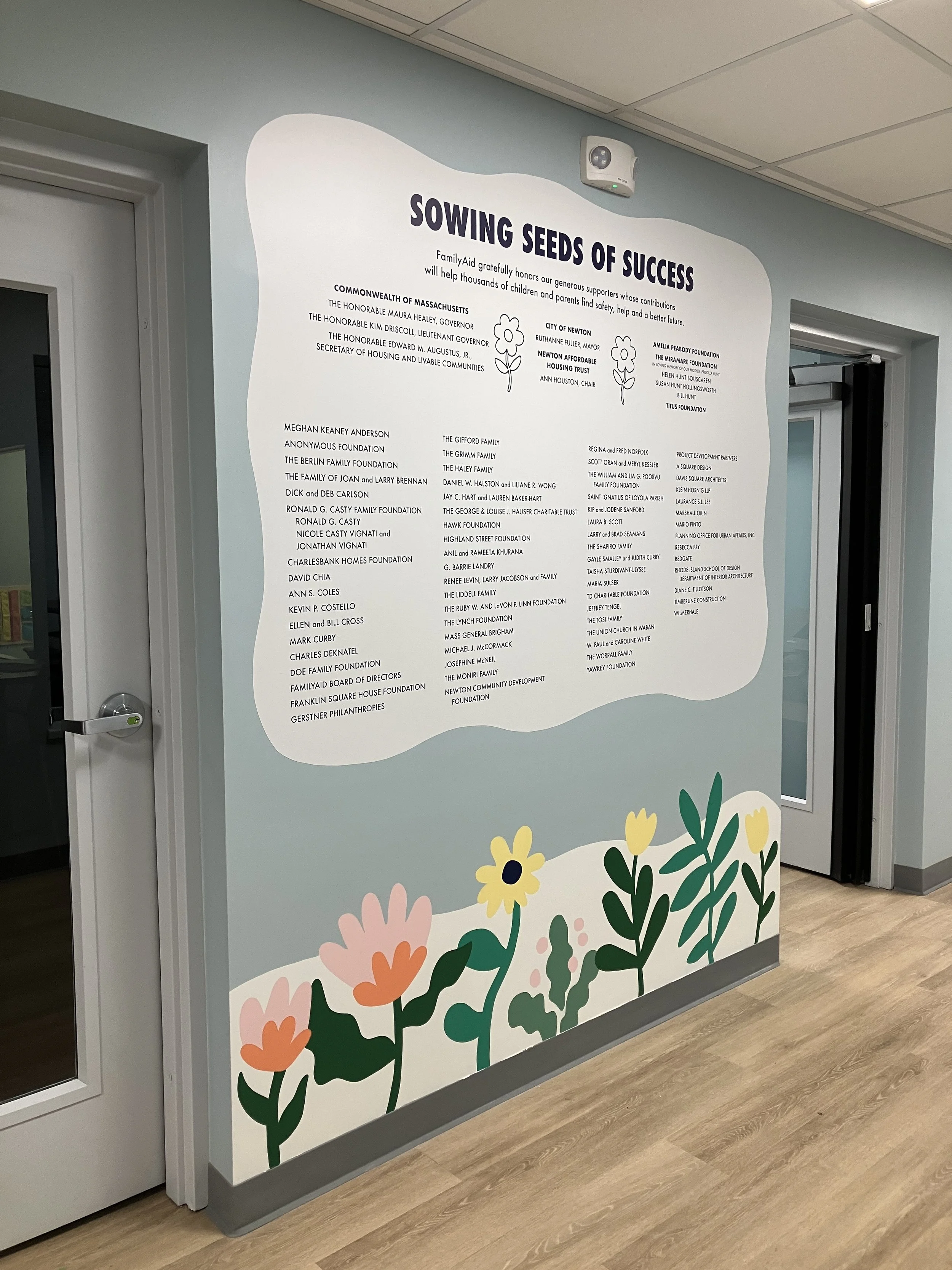 Project Details: Rebecca was commissioned by FamilyAid Boston to design and produce 30+ vignette interior murals for their new residential location for refugee families looking for resources in the Boston area. Rebecca worked with art-production specialist Marshall Okin of ArtEtcNY to design and produce this large-scale mural project.