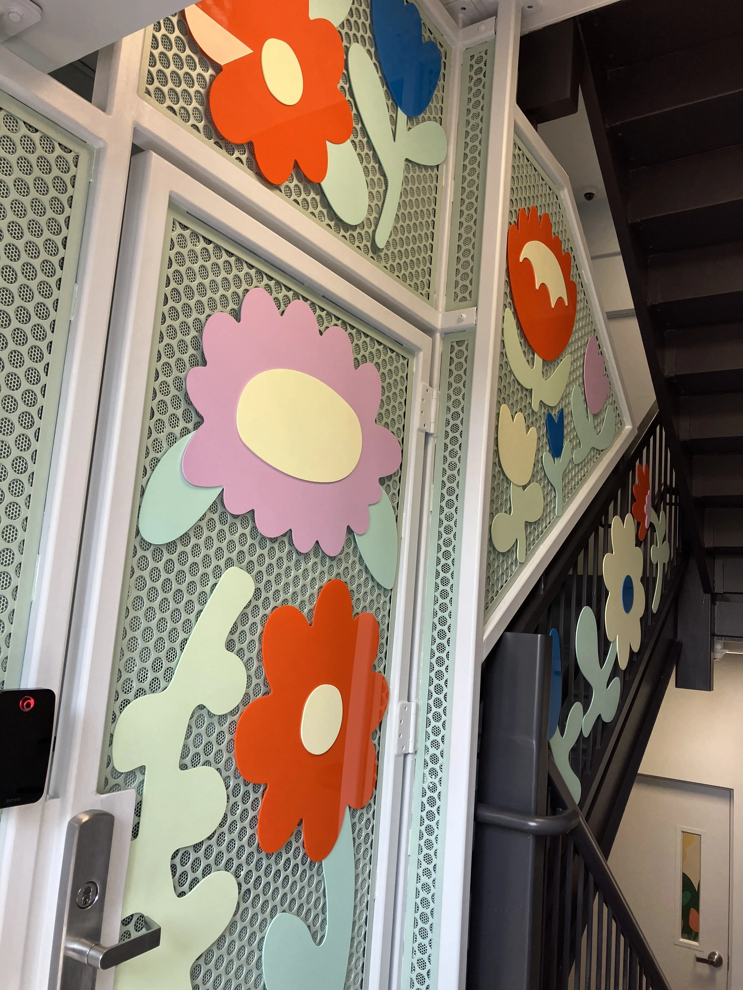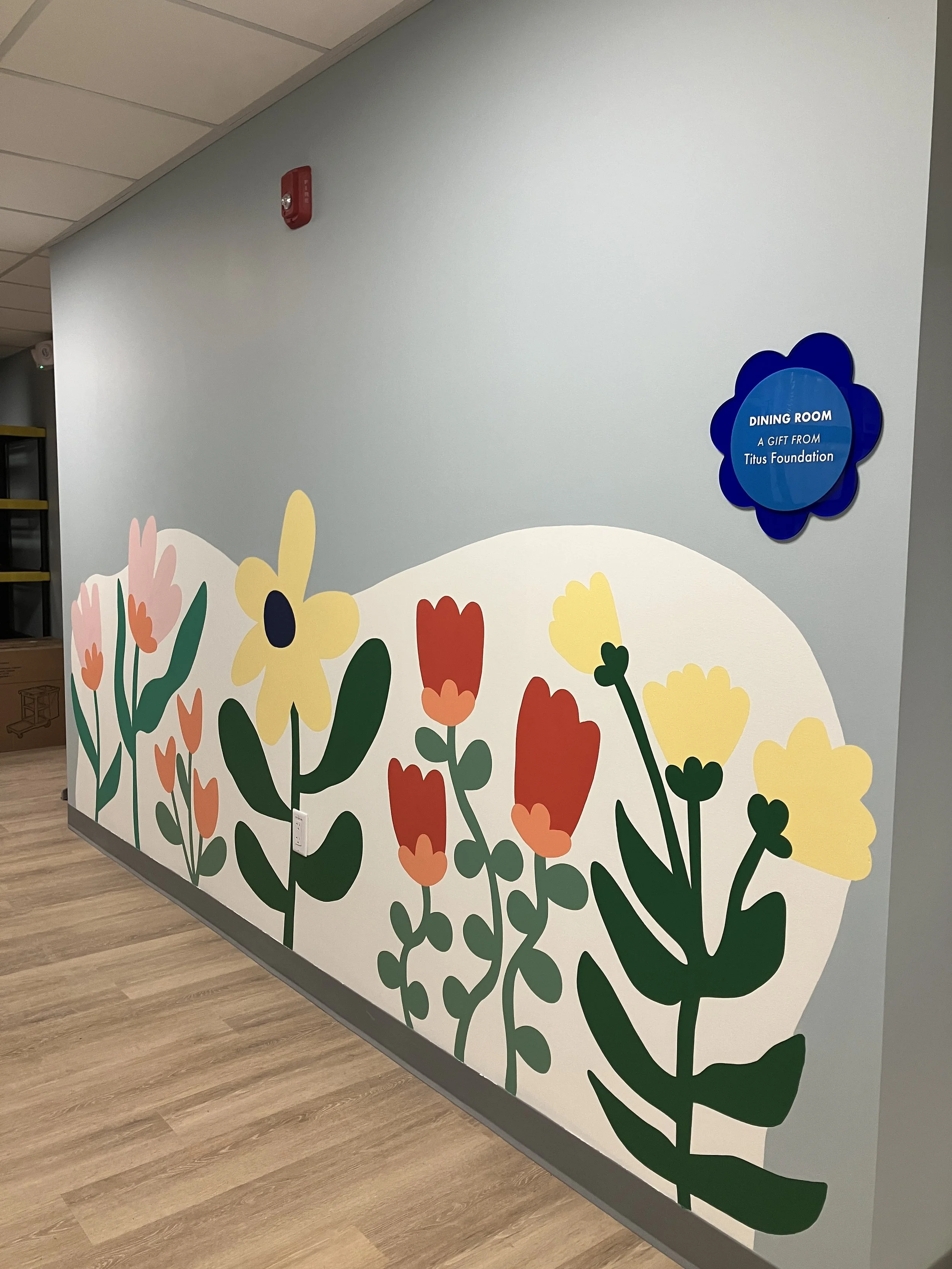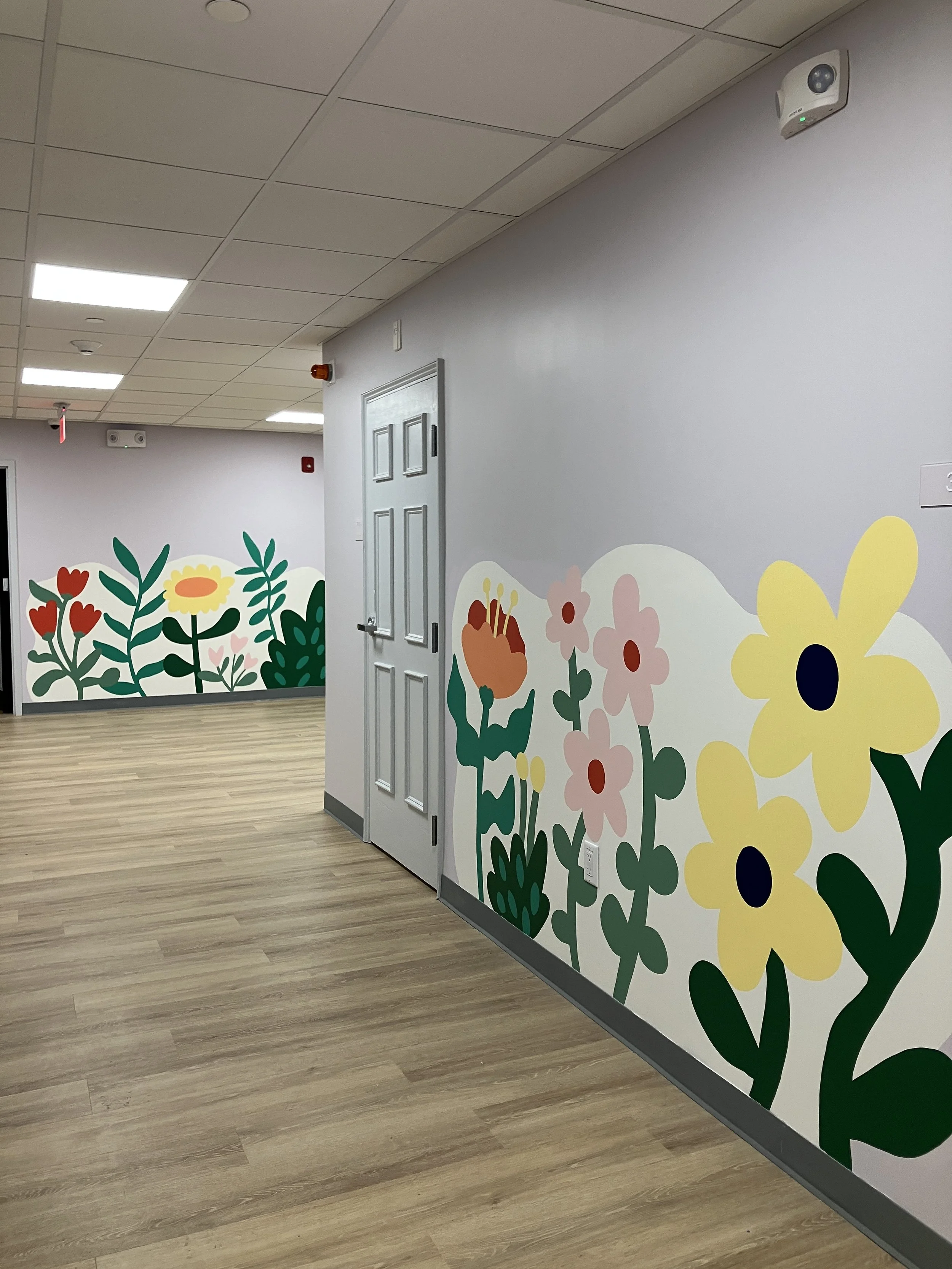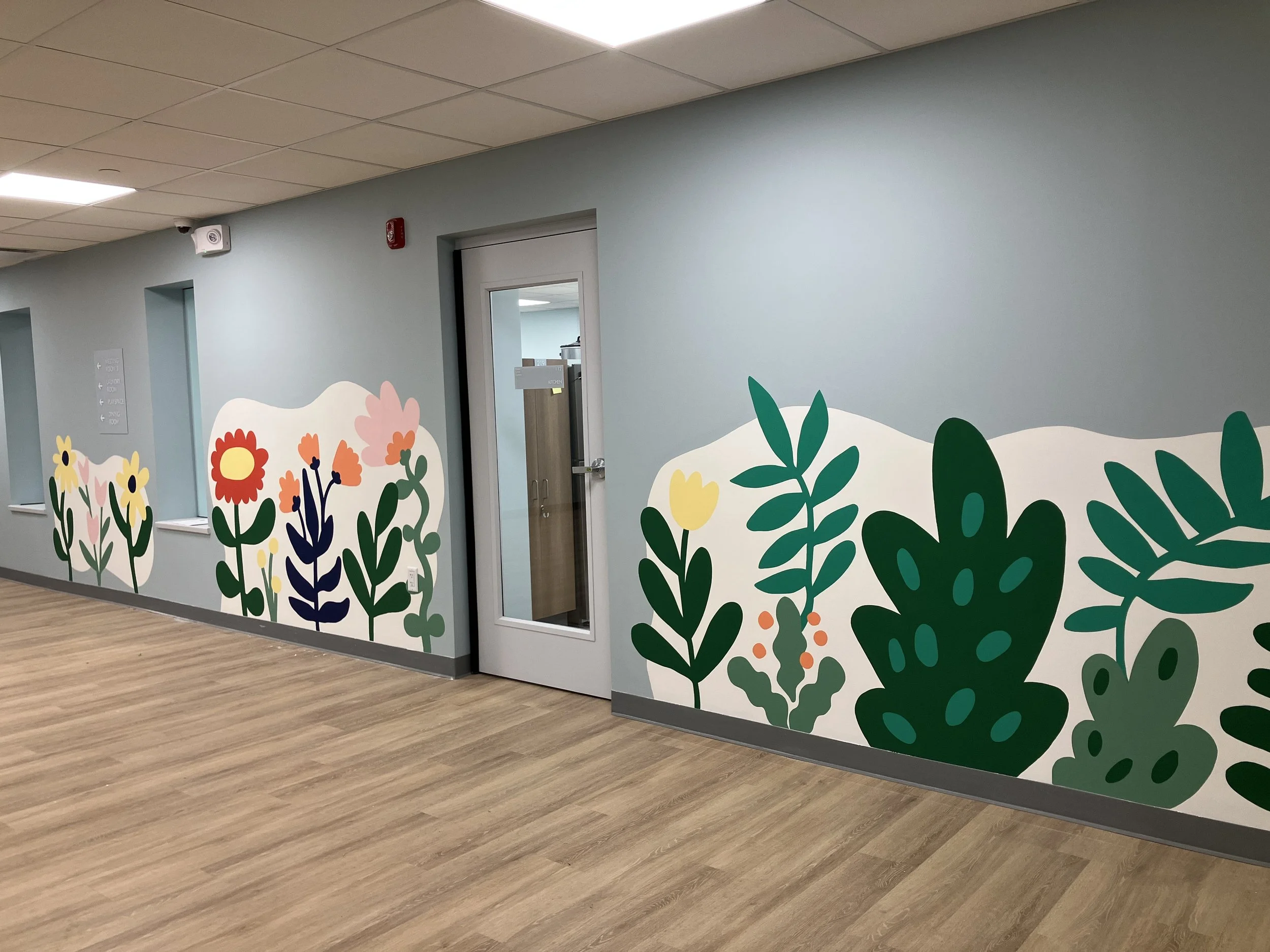 Rebecca provided full color sketches for review to the client and worked diligently with the client to create an environment that was welcoming to all ages. Rebecca and ArtEtc also created vinyl installations for the donor wall, as well as cut-acrylic custom art installations around the space and in the stairwell.