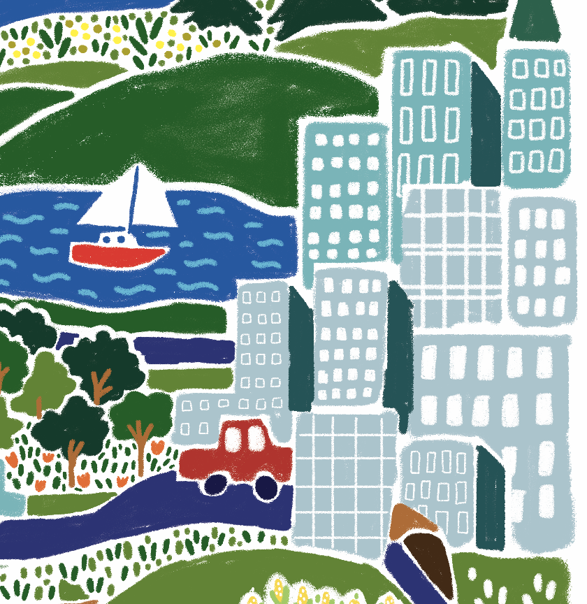 Rebecca was inspired by the changing of landscapes and wanted to create a seamless illustration incorporating little easter eggs hidden in the illustration to be discovered as you look at it.